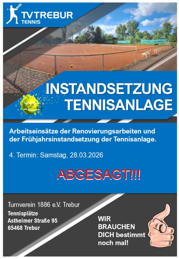 WeiterlesenDer Vorstand der Tennisabteilung des TV 1886 Trebur lädt alle Mitglieder der Abteilung zur Jahreshauptversammlung für das Jahr 2025 herzlich ein. Die Versammlung findet am Donnerstag, den 09.04.2026 um 19:00 Uhr in der Tennisklause auf der Platzanlage an der Astheimer Straße statt. Einladung JHV 2025
